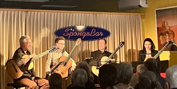 Elementos nennt sich das seit gut zwei Jahren existierende Gitarren-Quartett mit Sascha Lorenz, Sylvie Manoian, Andreas Schumacher, Michal Stanikowski. Es präsentierte dem Publikum in der SpongeBar ein breit gefächertes Klassik-Repertoire, das die Zeitspanne der letzten vier Jahrhunderte umfasst.